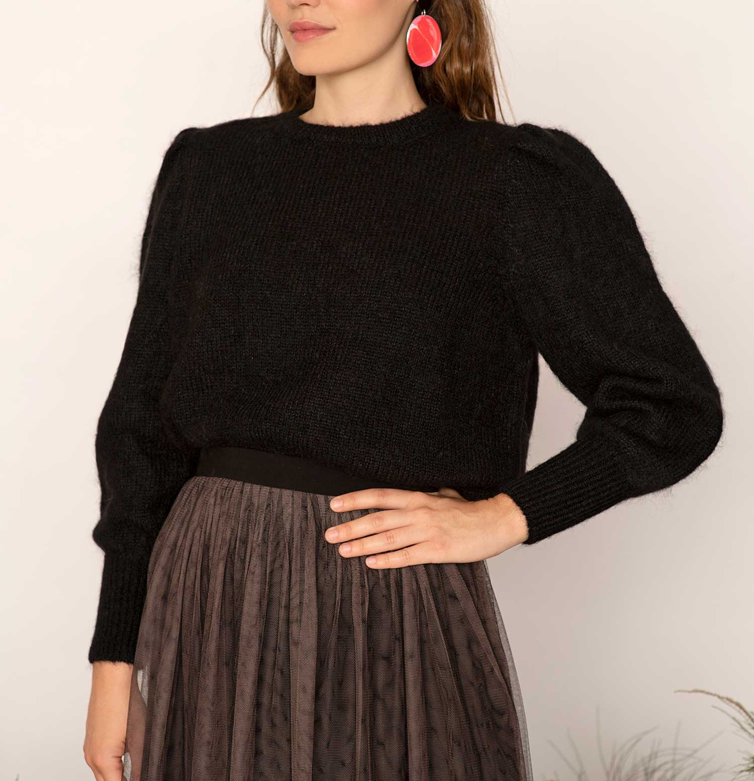 Long sleeves gathered at the top. It is a short jumper but very well structured.