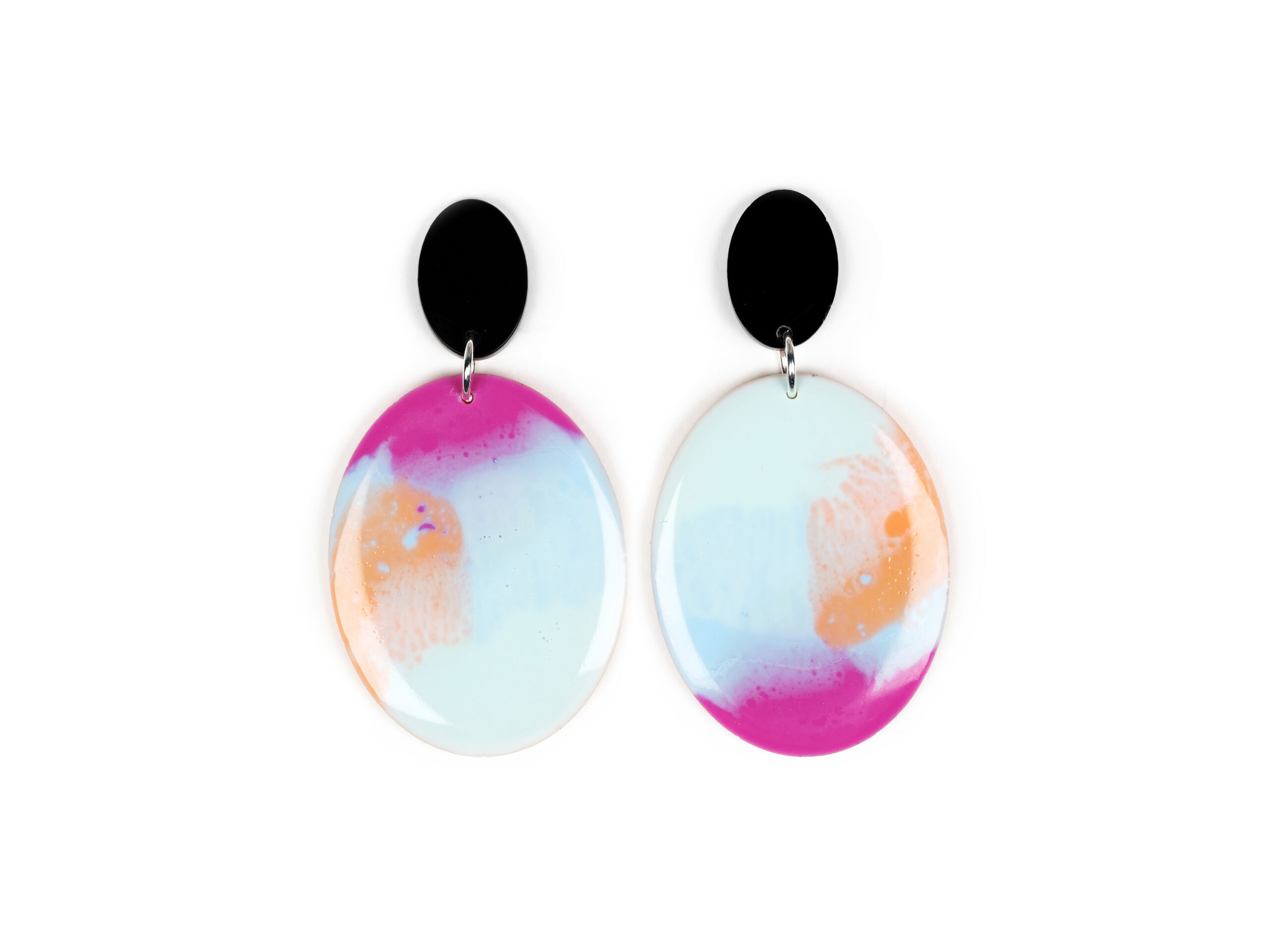 Material: Eco resin oval earrings, with silver push-back closure. Color: Fuchsia, Turquoise and Orange.