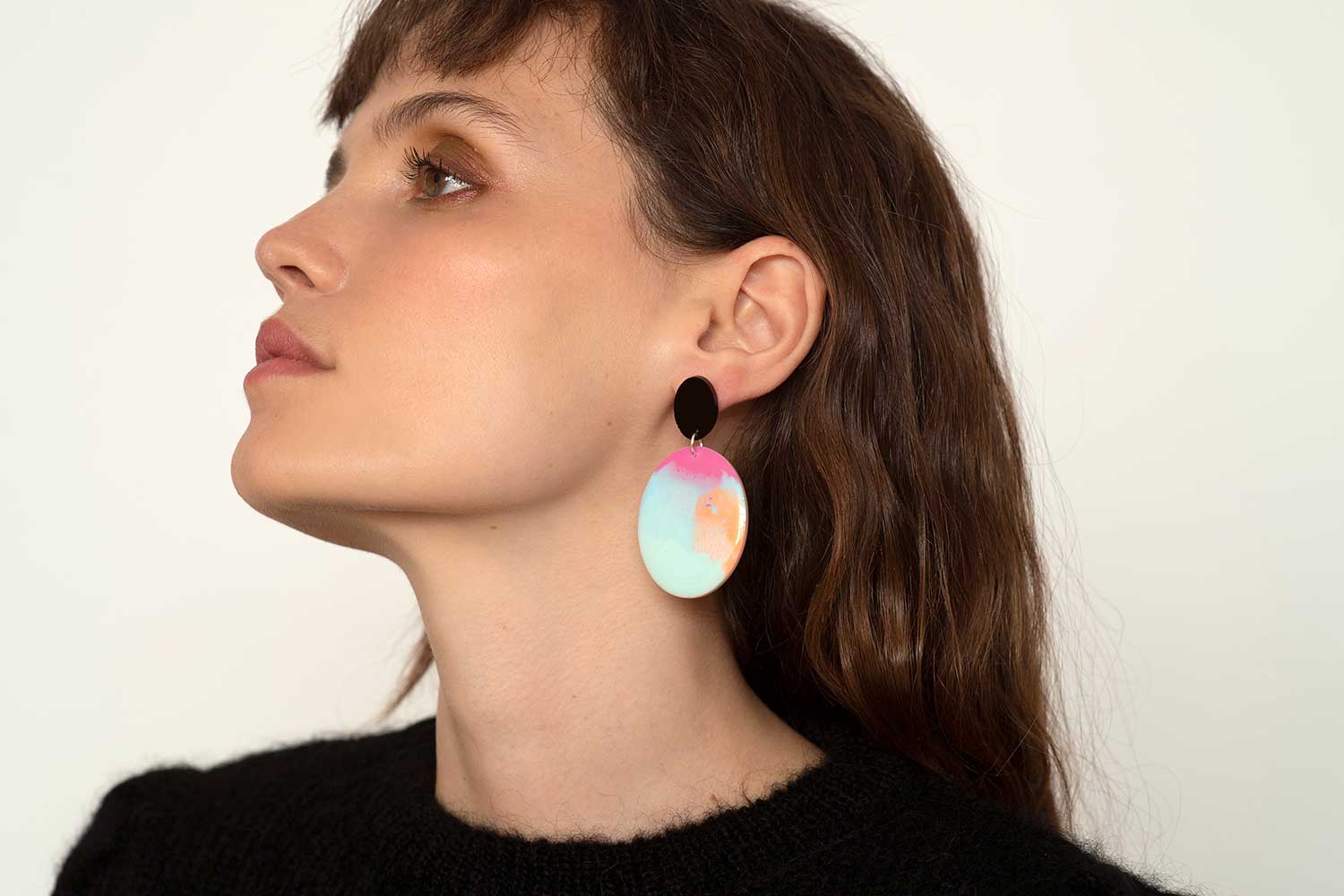 Each earring is unique and singular both due to the nature of the material and because it is an abstract painting, that’s why there are no identical earrings.